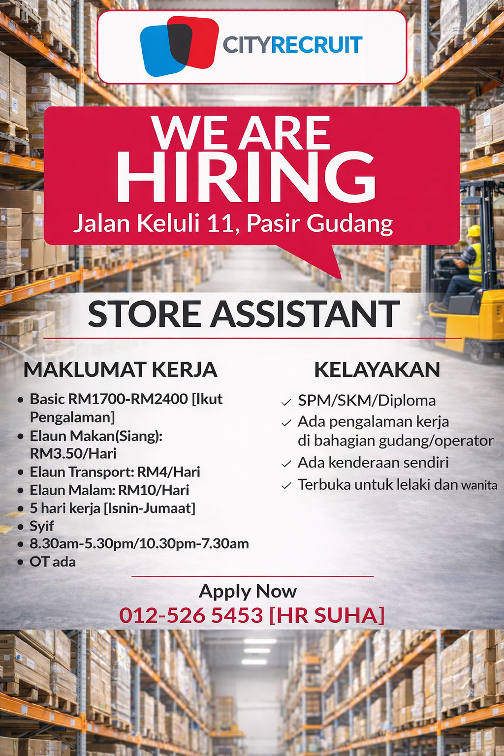 Masa bekerja: Isnin – Jumaat, 8.30am – 5.30pm (Ada Overtime)