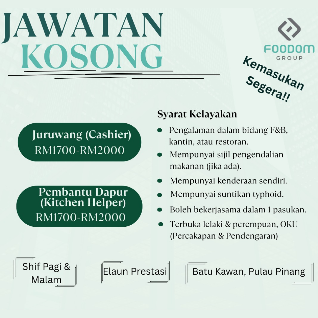 Foodom Group Sdn. Bhd. sedang mencari individu yang rajin, bertanggungjawab dan berminat untuk menyertai pasukan kami sebagai Kru Kantin / Pembantu Operasi. Calon akan membantu dalam operasi harian kantin termasuk penyediaan makanan, perkhidmatan pelanggan, dan kerja-kerja am dapur.