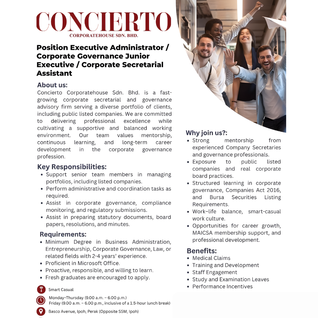 - Assist in corporate governance, compliance monitoring, and regulatory submissions.