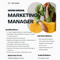 - Handle content planning, social media, digital marketing (ads), email marketing, sometimes offline marketing (posters, flyers, media ads).